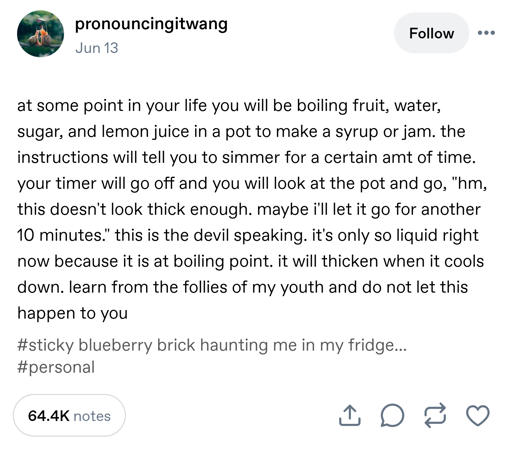 Text reads: “at some point in your life you will be boiling fruit, water, sugar, and lemon juice in a pot to make a syrup or jam. The instructions will tell you to simmer for a certain period of time. Your timer will go off and you will look at the pot and go “hm this doesn’t look thick enough, maybe I’ll let it go for another 10 minutes”. This is the devil speaking. It’s only so liquid right now because it’s at boiling point. It will thicken when it cools down. Learn from the follies of my youth and do not let this happen to you.”