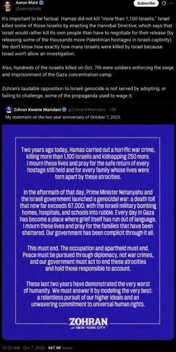 I don’t understand why there is a negative focus on this. Sure, it could be seen that it’s dumb he has to do the whole condemning the attack thing, but for one, it’s the anniversary of it, and two, if he didn’t both the Republicans and the bastards at the DNC would eat him alive. Zohran is probably one of the best and most productive left Democrats currently. I bet he has one of the better and more aggressive takes on Israel at this moment than damn near anyone else, so why focus on nitpicking his statement?