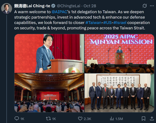 arrow-up128arrow-down1imagePresident of Taiwan welcomes AIPAClemmy.mlgeneva_convenience@lemmy.ml to Progressive Politics@lemmy.world · edit-28 days agomessage-square14fedilink