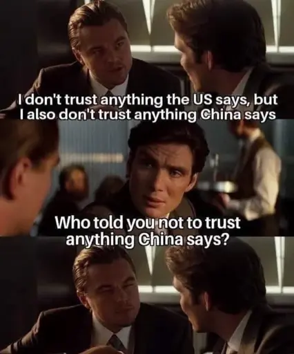 He said he doesn’t trust both the US and China, he never says someone told him anything. I’m thinking false dilemma?