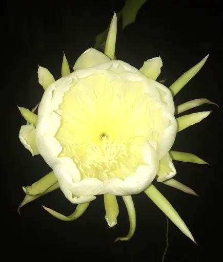 They bloom at night, this was the first one (on the full moon) and hand-pollinated since there aren’t many pollinators at night. Looks like it worked since the fruit is developing.