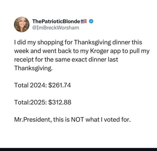 This got reported as “not LAMF” on the grounds that this person voted for lower grocery prices and got higher ones. This is an understandable argument, because just getting tricked on its own (even if you’re unbelievably stupid to think that things like illegal tariffs and deregulation wouldn’t do this) is not LAMF.