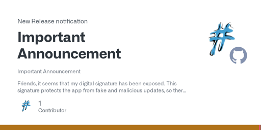 Important Announcement Friends, it seems that my digital signature has been exposed. This signature protects the app from fake and malicious updates, so there is a risk that someone may try to rele...