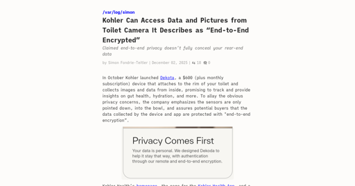 arrow-up192arrow-down1external-linkKohler Can Access Data and Pictures from Toilet Camera It Describes as “End-to-End Encrypted”varlogsimon.leaflet.pubKing@blackneon.net to Technology@lemmy.zipEnglish · 3 months agomessage-square32fedilink