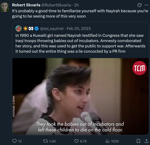 The Nayirah testimony was false testimony given before the United States Congressional Human Rights Caucus on October 10, 1990, by a 15-year-old Kuwaiti girl who was publicly identified only as Nayirah at the time, and presented herself as having been a volunteer nurse at a Kuwaiti hospital at the time of the Iraqi invasion of Kuwait. In her testimony, which took place two months after the invasion, she claimed to have witnessed Iraqi soldiers taking premature babies out of incubators in a maternity ward before looting the incubators and leaving the babies to die on the floor. Nayirah’s statements were widely publicized and cited numerous times in the United States Senate and by American president George H. W. Bush to contribute to the rationale for pursuing military action against Iraq. Her portrayal of Iraqi war crimes was aimed at further increasing global support for Kuwait against the Iraqi occupation during the Gulf War, which resulted in the expulsion of Iraqi troops from Kuwait by a 42-country coalition led by the United States. In January 1992, it was revealed that Nayirah had never been a nurse.