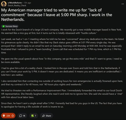 I have no idea if this is a true story, but i definitely hope it is. Unfortunately, as with most American cultural products, eventually Europe starts to import them (as we did with American culture war bullshit), and this toxic “hustle culture” is now slowly also becoming more normalized in some places in Europe, particularly in Germany. It’s definitely not the norm as it is in the US, and for the time being we still have laws against it (though with Blackrock Merz in charge who knows for how long…), but i am seeing signs of it popping up more and more.