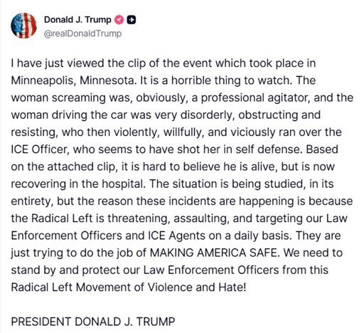 The two videos available show clearly that ICE needlessly murdered a woman who was not putting them in any danger. Trump is either lying or lost in his demented fantasies.
