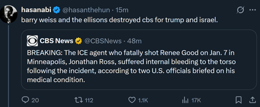 So… not a primary source, not an unbiased source, not a named source, from an administration that’s shown to be a demonstrably unreliable source, and laughably contrary to the objective evidence that the vast majority of people have seen directly. “Two fucking guys - don’t worry who, exactly - in the government with an agenda to justify their actions and policies just lied through their teeth to obfuscate the obvious truth in order to protect a murderer from consequences and keep their base from feeling bad for the victims of their deployment of unqualified violent racist kidnappers into areas full of perceived political enemies.” Fucking “BREAKING” news, indeed.