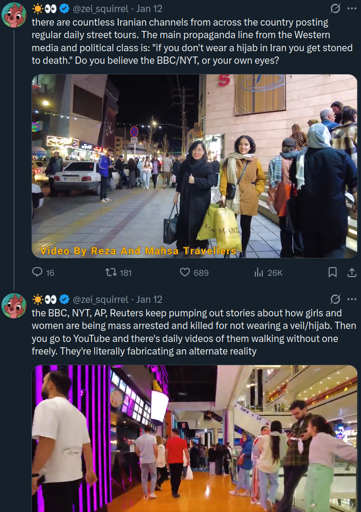 The mental gymnastics people are doing to avoid just going to Youtube and watching one or multiple of the hundreds of videos of people walking around Iran is extremely impressive.