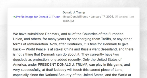 If he was so concerned about safety and Russian or Chinese attacks, he could just… you know… reinforce the Greenlandic NATO bases. They’re literally allies. I’m so sick of this clown show.