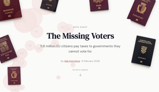 Beep@lemmus.org to Europe@feddit.orgEnglish · 2 months agoThe Missing Voters: 11.8 million EU citizens pay taxes to governments they cannot vote for.homolova.skexternal-linkmessage-square20fedilinkarrow-up156arrow-down13