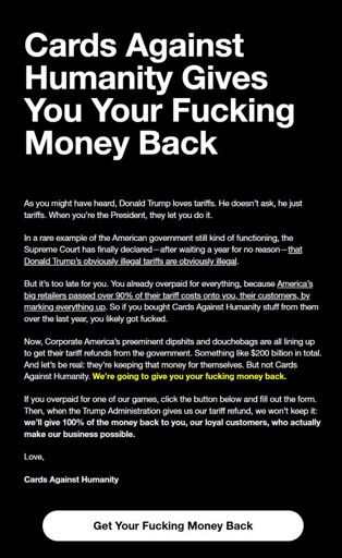UnderpantsWeevil@lemmy.world to Not The Onion@lemmy.worldEnglish · 2 months agoCAH Gives You Your Fucking Money Backlemmy.worldimagemessage-square72fedilinkarrow-up11.78Karrow-down112
