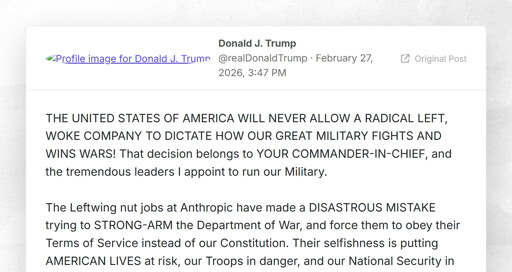 The Leftwing nut jobs at Anthropic have made a DISASTROUS MISTAKE trying to STRONG-ARM the Department of War, and force them to obey their Terms of Service instead of our Constitution. Their selfishness is putting AMERICAN LIVES at risk, our Troops in danger, and our National Security in JEOPARDY.