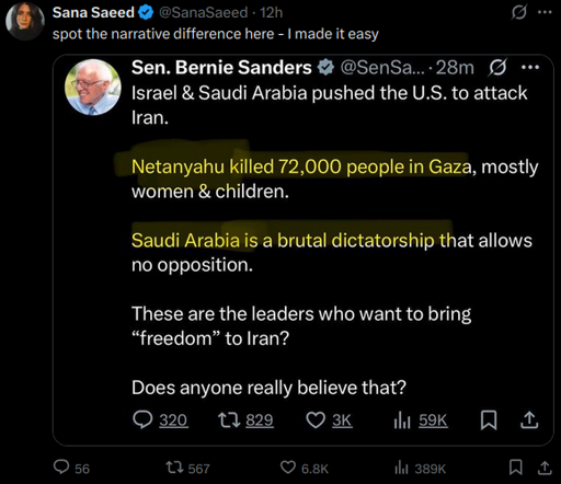 Or, we can just understand the actual point of the tweet which is against the attacks on Iran, and the hypocrisy of the US, Israel, and Saudi Arabia