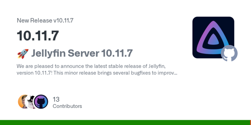 We are pleased to announce the latest stable release of Jellyfin, version 10.11.7! This minor release brings several bugfixes to improve your Jellyfin experience. As alway...