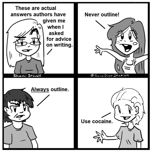 Writers should also try to “expand their toolbox”, meaning they should be able to use different methods. Just keep practicing writing with the tools you have and the techniques and tools you discover. Eventually, you’ll find what works for you. You can’t just expect to use a tool proficiently without practice. But everybody is different, so in the case of outlining, for example, if you practice with it and it just doesn’t work, then you’ll eventually know that it won’t work for you.