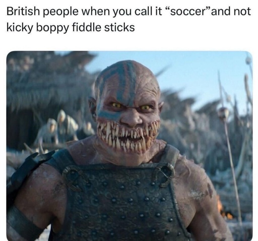 minus-squareDisgruntledGorillaGang@reddthat.comlinkfedilinkarrow-up21arrow-down6·11 hours agoThe British invented the term soccer. If they give you shit about using it, tell them they can fuck right off.