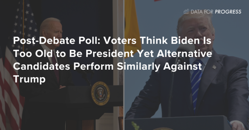 Ragdoll X@lemmy.world to politics @lemmy.world · 1 year agoIn Post-Debate Poll, Voters Think Biden Is Too Old to Be President Yet Alternative Candidates Perform Similarly Against Trumpwww.dataforprogress.orgexternal-linkmessage-square16fedilinkarrow-up10arrow-down10