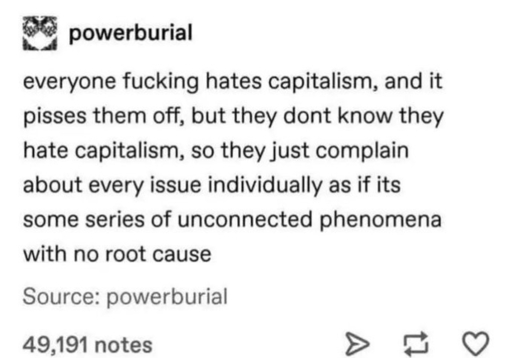 Blaming “capitalism” for all of society’s problems is about as useful as blaming God or some gremlins. For example, if you’re in the USA and you blame “capitalism” for your problems, then what are you gonna do about it? There is no path to change this society from capitalism to socialism or communism. We have entire armies of military and police who will ensure that the status quo stays in place. You also can’t vote your way out of this. No candidates advocating such changes will be elected.
