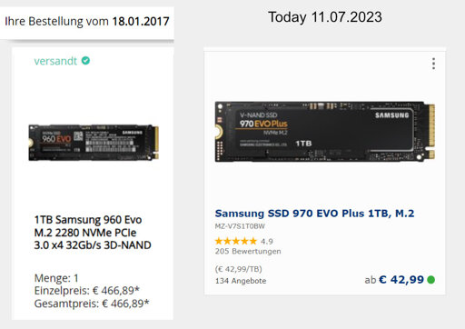 OrangeCorvus@lemmy.world to Technology@lemmy.worldEnglish · edit-23 years agoIn 2017, I bought a 1TB 960 Evo for 466€. Now, in 2023 the 1TB 970 Evo Plus is 43€.plus-squarelemmy.worldimagemessage-square0fedilinkarrow-up11arrow-down10